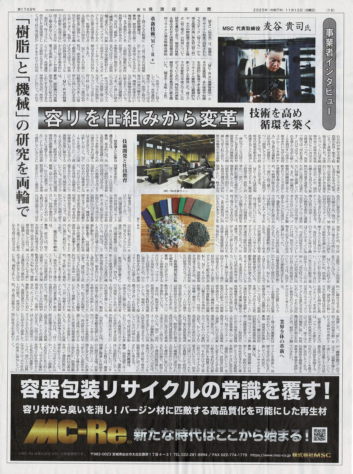 循環経済新聞にMC-Re®︎の広告が掲載されました